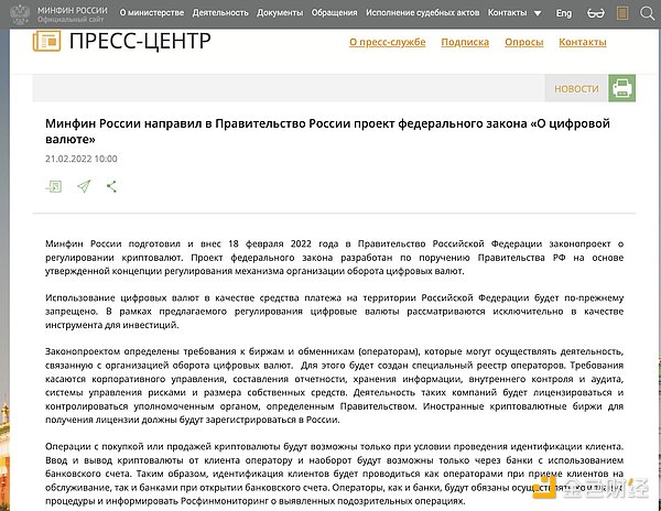 此前2月18日消息,俄罗斯联邦财政部提交“关于数字货币”草案,通知政府就加密货币交易规则发起公众咨询。该部预计将在3月18日之前完成对加密法案的公众咨询。