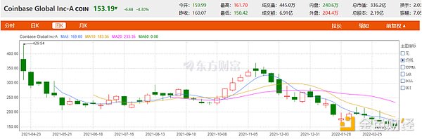 伴随着近期加密市场的震荡,加密交易所的股价也不断走低。行情显示,Coinbase 股价创下历史新低,短时触及 150.42 美元的历史低点。其股价最低时相较 429.54 美元的最高点已下跌近65%。